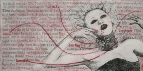 Cindi enjoys working with many different media, but is particularly drawn to technically challenging work, such as analog photography and darkroom processes, printmaking, and digital media. Her work has been informed by the themes and certain elements in the works of such artists as: David Altmejd, Diane Arbus, Sue Coe, Oliver Herring, Frida Kahlo, Fiona Kinsella, and Sally Mann. Cindi also draws inspiration from popular culture artists, musicians, and filmmakers that work with horror and gothic aesthetics.