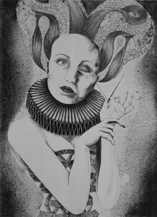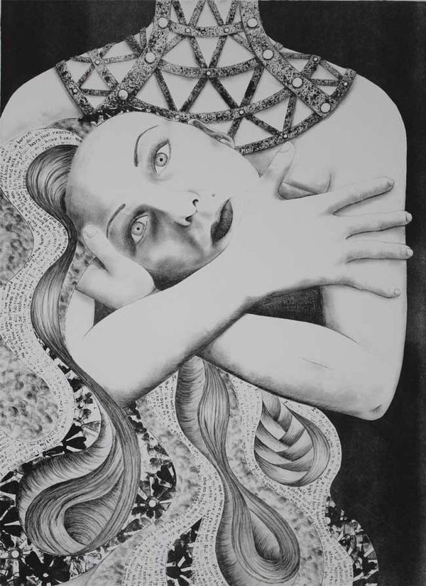 Most of Cindi’s recent works explore themes of femininity and its social implications. She often pairs feminine imagery with masculine traditions and traditional techniques with contemporary subject matter. She likes to combine seemingly disparate elements such as beauty and horror, attraction and repulsion, and refinement and crudeness while trying to make the contrast work together in an aesthetically pleasing way. Cindi’s themes tend to be dark, but gracefully executed, and her work often has a somewhat disturbing, psychological quality to it.